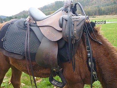 Es gilt den richtigen Sattel für die hohen Belastung des täglichen Reitens, auch mit viel Gepäck, wie es beim Wanderreiten der Fall ist, zu finden. Ich halte überhaupt nichts von den klassischen Stocksätteln (z.B. Westernsättel) die riesige Auflageflächen haben, keinerlei Flexibilität im Baum. Diese Sättel können nicht passen bzw passen nur in einer einzigen Stellung. Daher brauchen sie ja auch diese Monsterpads darunter. Ich kenne einige Reiter mit Westernsätteln deren Pferde auch eine Atrophie des Trapezmuskels haben obwohl der Sattel angeblich prima passt.... Auch die klassischen Dressursättel taugen in meinen Augen dazu nicht da ihre Auflagefläche zu klein ist und man das Gewicht des Gepäcks auch nicht über den Sattelbaum verteilen kann da er keine überragenden Trachten hat.