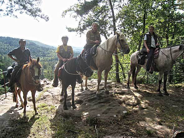 Karte wählen - Infos: Klick auf Tracks/Marker Dieser Rundritt führt uns, ausgehend von einem Parkplatz südlich von Fischbach bei Dahn, erst nach Norden durch den Ort, am Fischbach entlang, dann erst leicht, dann steiler ansteigend bis bei km 7 (200m Anstieg) die "hohlen Felsen" erreicht sind. Wir umrunden die Felsformationen mit dem kleinen Mückenkopf als höchstem Berg im Norden. Abwärts geht es, hinunter ins Glastal, dann wieder aufsteigend, 100m höher bei km 16 emachen wir einen Abstecher zum Zigeunerfelsen, dann vorbei am Reitersprung erreichen wir unseren höchsten Punkt mit 440m bei km 18, kurz darauf auch das Wanderheim (PWV) Hohe List. Hier ist ein großes Sommerfest mit Musik und jeder Menge Leute. Die Pferde stehen im Schatten unter Bäumen und wir lassen es uns gut gehen (die Musik ist zwar nicht jedermanns Sache) aber das Essen entschädigt für vieles.