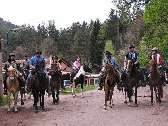 Dort rasten wir ein erstes Mal (ausser der ausgiebigen Fotorast an den Felsen). Nach der Pause mit Sekt, Bier, und Sprudel, Würstchen, gefüllte Oliven, Schokoriegel und... reiten wir nach Frankreich rein. Immer am Schnepfenbach entlang bis kurz vor Sturzelbronn, da nach links und rüber ins Nachbartal, am Camping (Muehlenbach) vorbei. Da riecht es so gut dass wir beschließen die Tour abzuändern und ins Restaurant Bremmendell zu reiten - da gibt's was zu trinken.