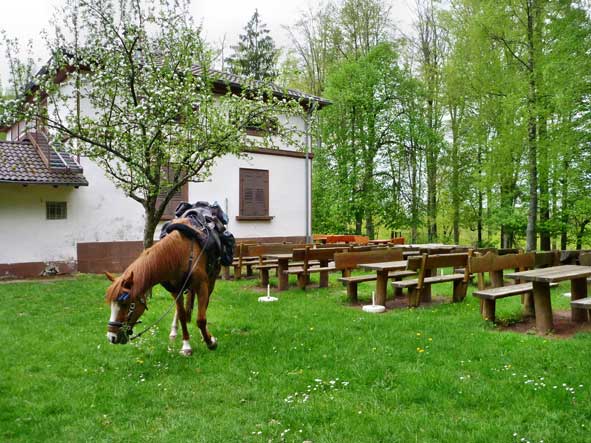 In Fischbach besorge ich mir was zu essen - Pony steht im (pardon "am") Fahrradständer. Dann reite ich das Fischbachtal hinauf, vorbei am Zigeunerfelsen (der deutsche), dem Reitersprung und dem Wanderheim "Hohe List" (leider geschlossen), dann noch ein kurzes Stück den gleichen Weg wie am Samstag und wir sind wieder am Ransbrunner Hof.